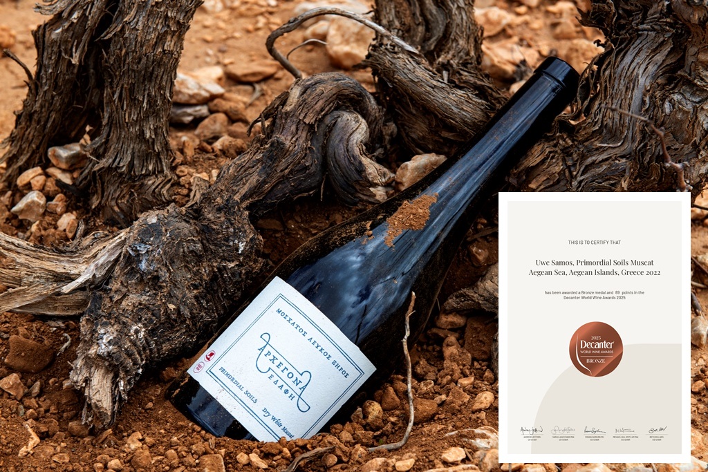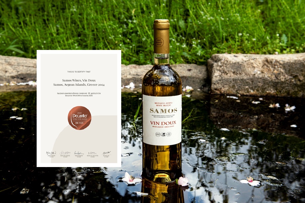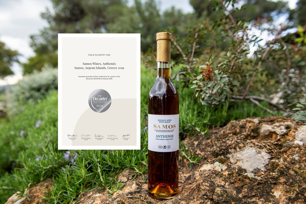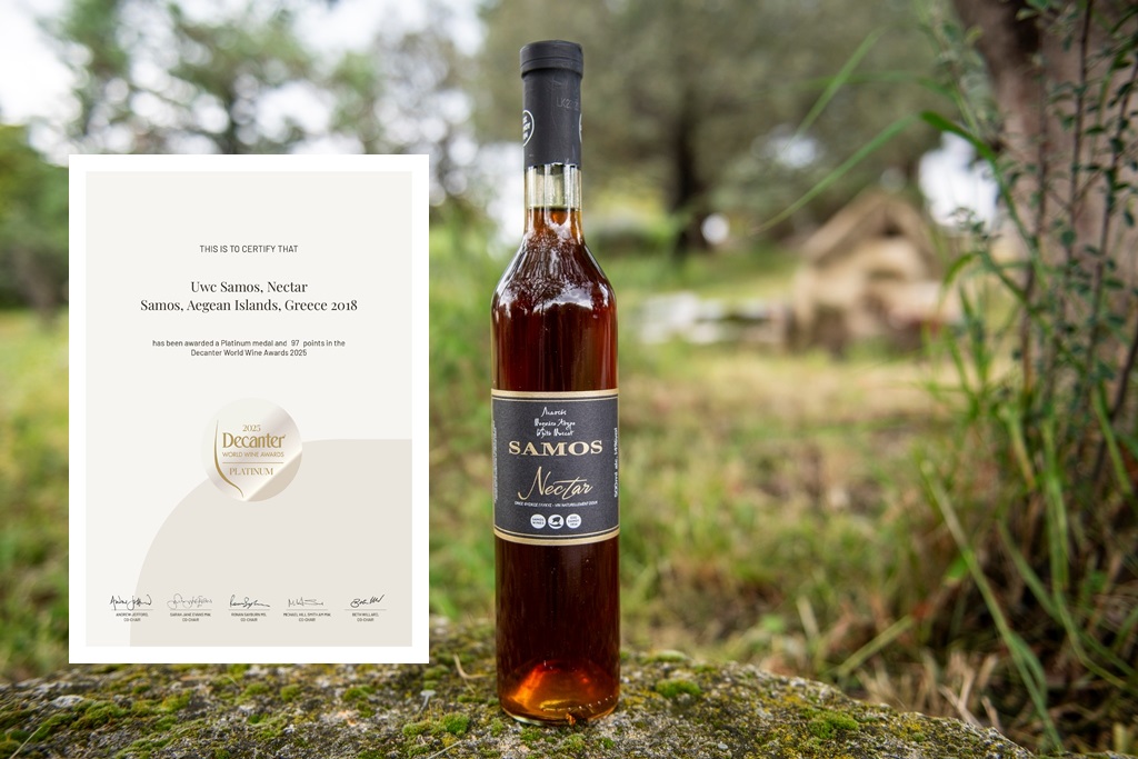 Το Samos Nectar βραβεύθηκε με Πλατινένιο Μετάλλιο και μία από τις υψηλότερες βαθμολογίες (97/100) στο διεθνή διαγωνισμό Decanter 2025.