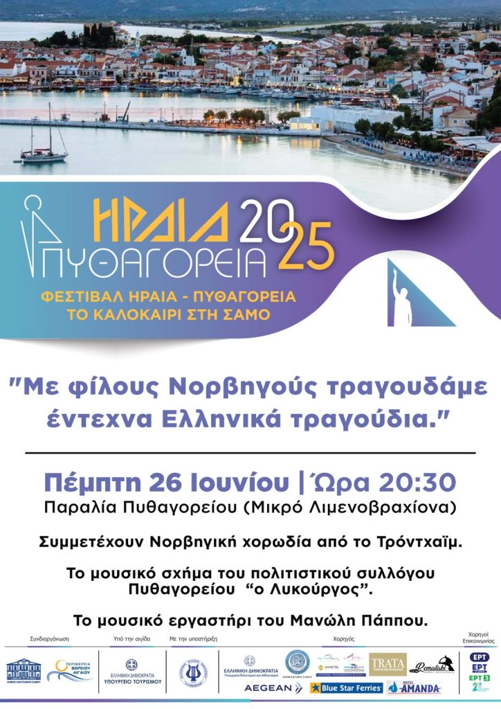 Την Πέμπτη 26 Ιουνίου στις 20:30, στον υπαίθριο χώρο του Art Space δίπλα στην παιδική χαρά στο Πυθαγόρειο, θα πραγματοποιηθεί υπαίθρια συναυλία με ελληνική μουσική, στα πλαίσια του φεστιβάλ ΗΡΑΙΑ ΠΥΘΑΓΟΡΕΙΑ 2025.